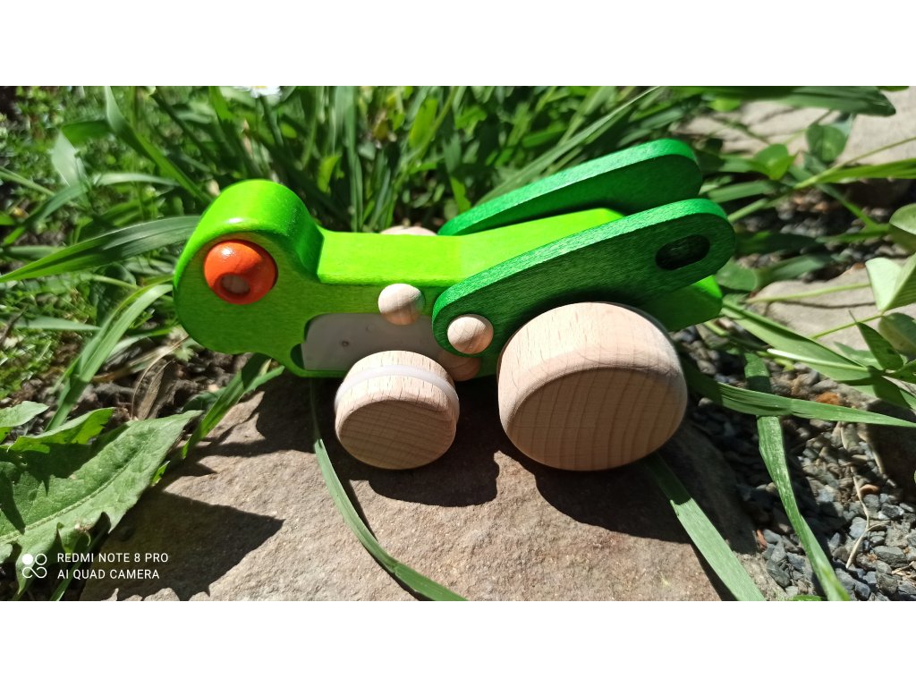Dřevěný cvrček na kolečkách pohybuje křídly, ale také vydává bzučivý zvuk podobný skutečnému cvrčkovi.