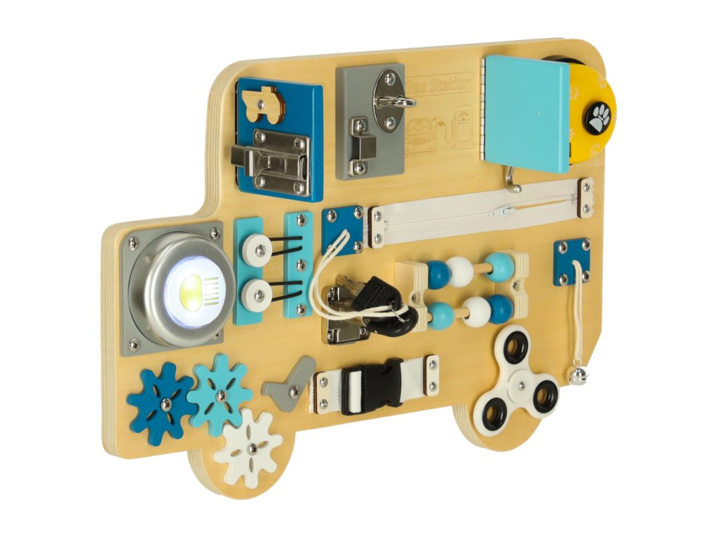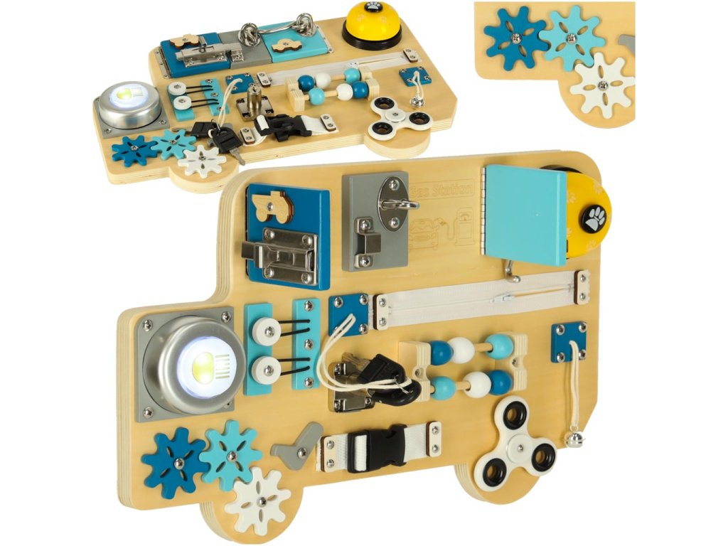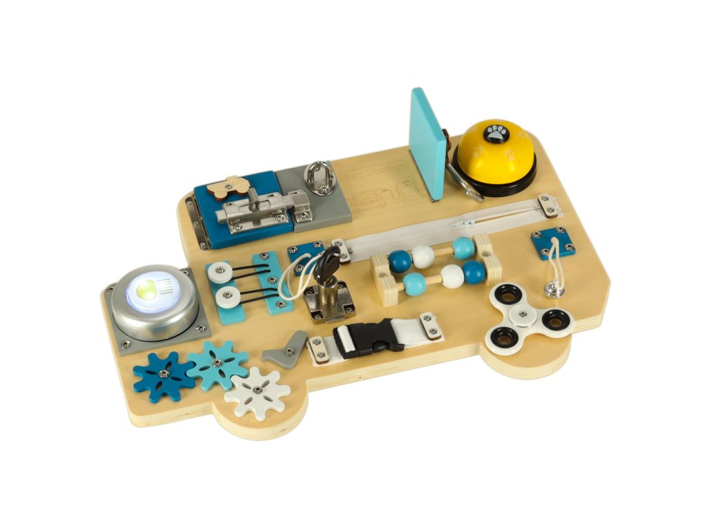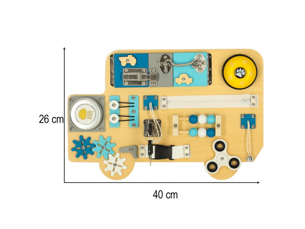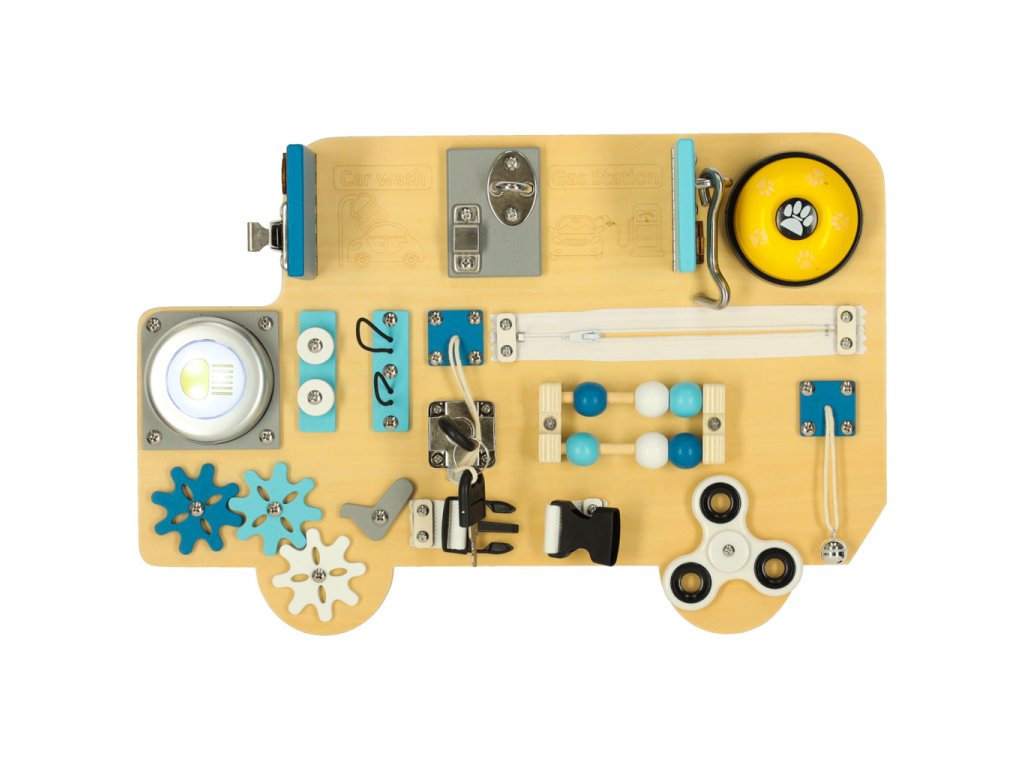 Dřevěná manipulační deska ve tvaru modrého autobusu je ideální vzdělávací hračka, která rozvíjí zručnost, logické myšlení a kreativitu dětí.