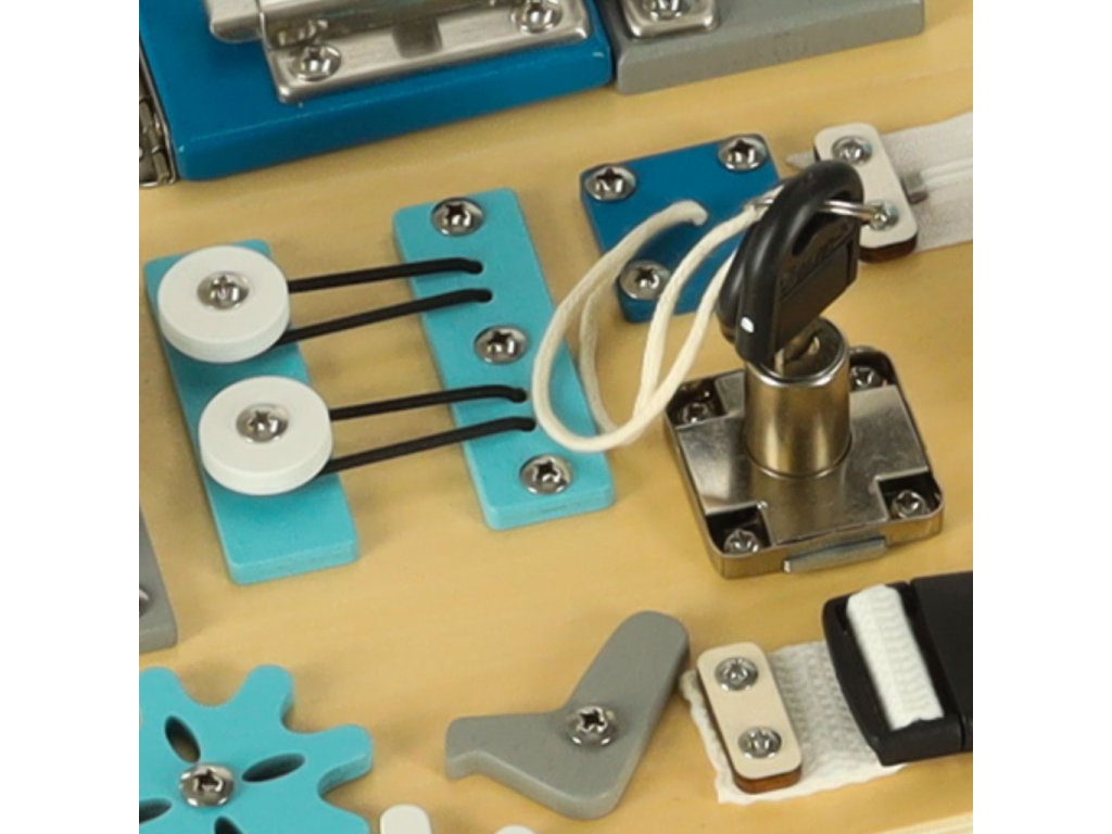 Tato smyslová tabule nabízí bezpečnou možnost, jak mohou batolata poznávat předměty každodenní potřeby, jako jsou klíče, zipy nebo vypínače, a zároveň trénovat jemnou motoriku. Hladce obroušené dřevo zaručuje bezpečné hraní, zatímco hravý autobusový design přitáhne pozornost každého malého milovníka autíček.