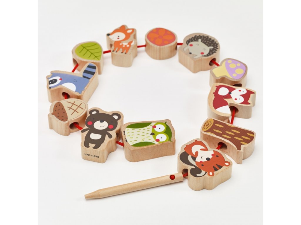 - - Sada se skládá z provázku a 12 korálků zobrazujících různá zvířata a lesní rostliny, m.i. : ježek, sova, kužel, list, houba.