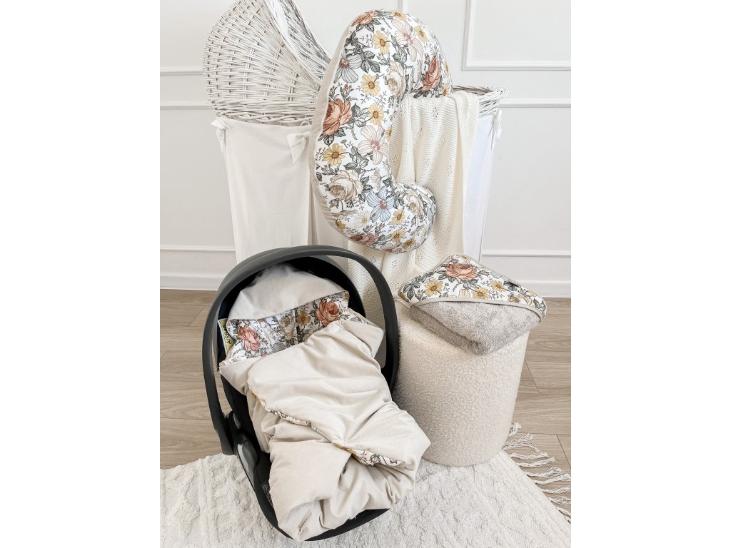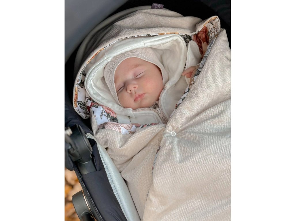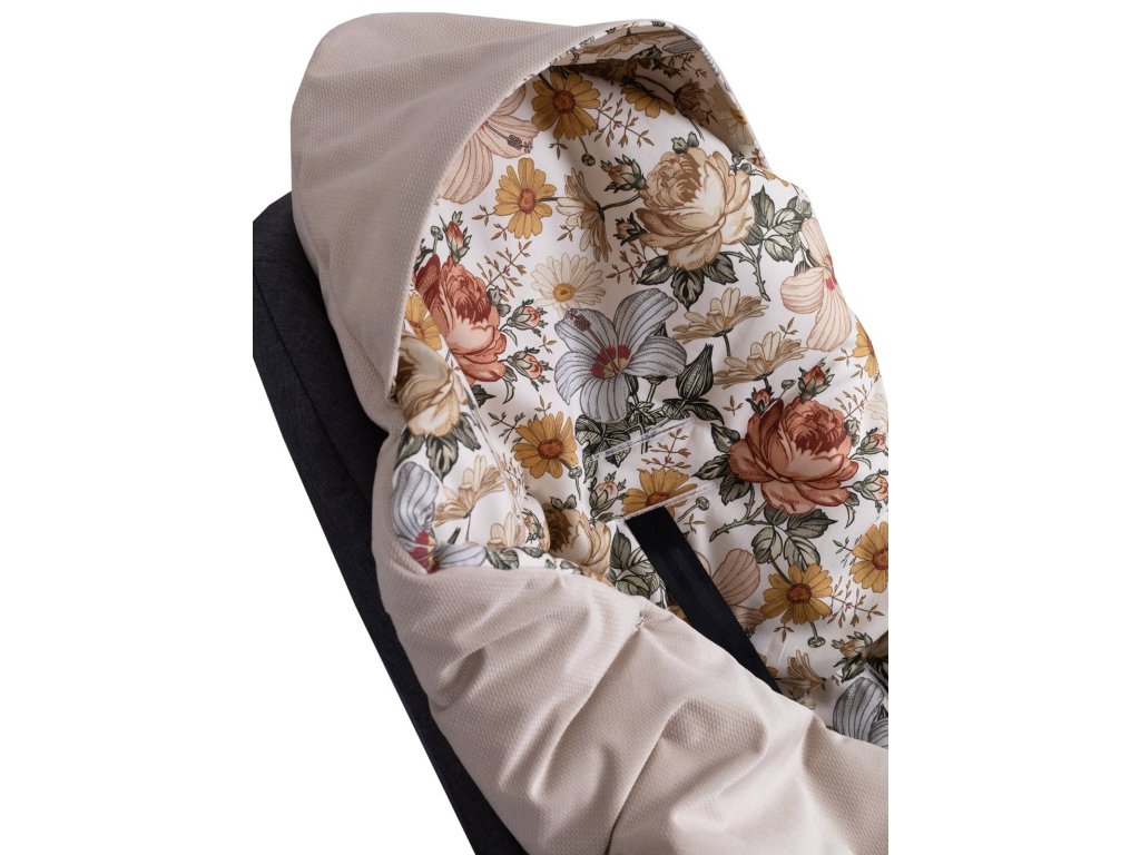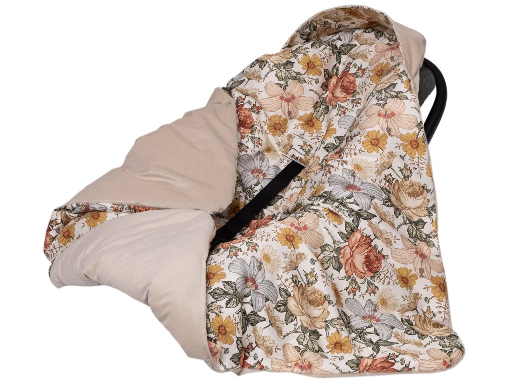 Přikrývka s kapucí do kočárku a autosedačky – oboustranná, hřejivá, s otvory pro pásy - květy/ béžová