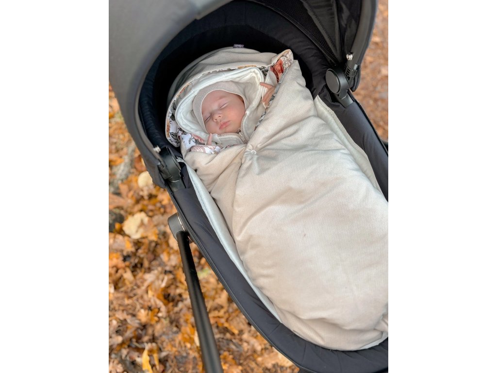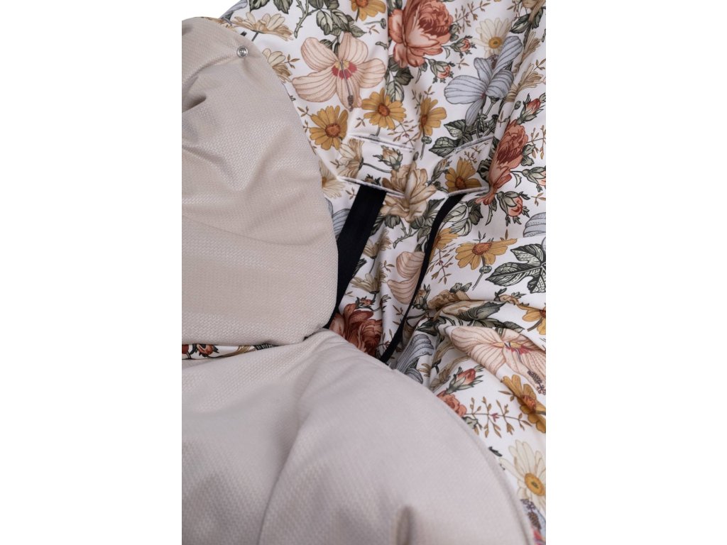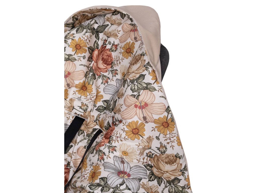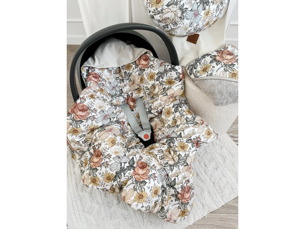 Přikrývka s kapucí do kočárku a autosedačky – oboustranná, hřejivá, s otvory pro pásy - květy/ béžová