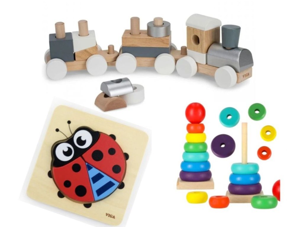 Sada tří hraček pro nejmenší – Dřevěný vláček | Baby Puzzle Beruška | Duhová pyramida